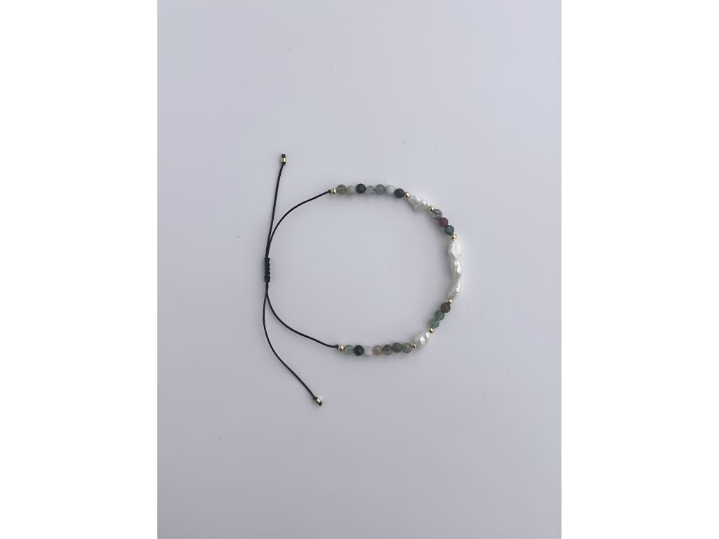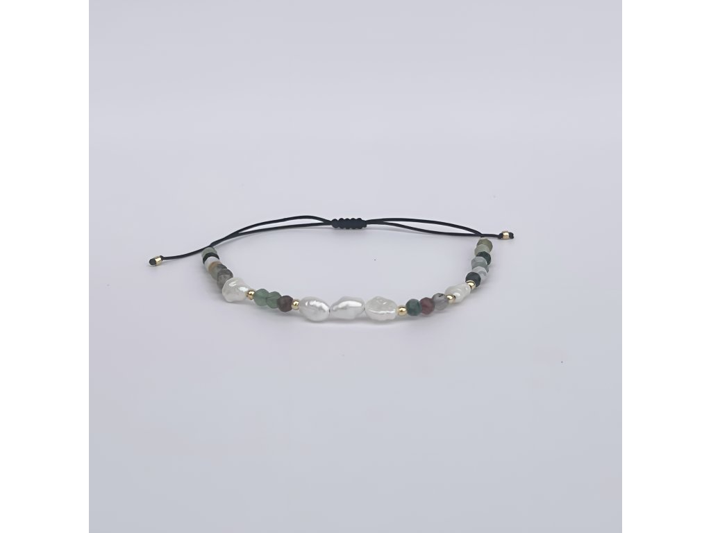 Jemný náramek s říčními perlami, achátem a zlatými nerezovými korálky. Možnost balení v dárkové krabičce.