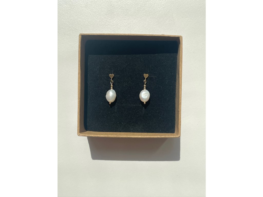 Náušnice s říčními perlami, v barvě white, s jemným detailem srdíčka. Jsou vyrobeny z kvalitního gold filled materiálu, který je skvělou volbou pro citlivou pokožku i každodenní nošení.