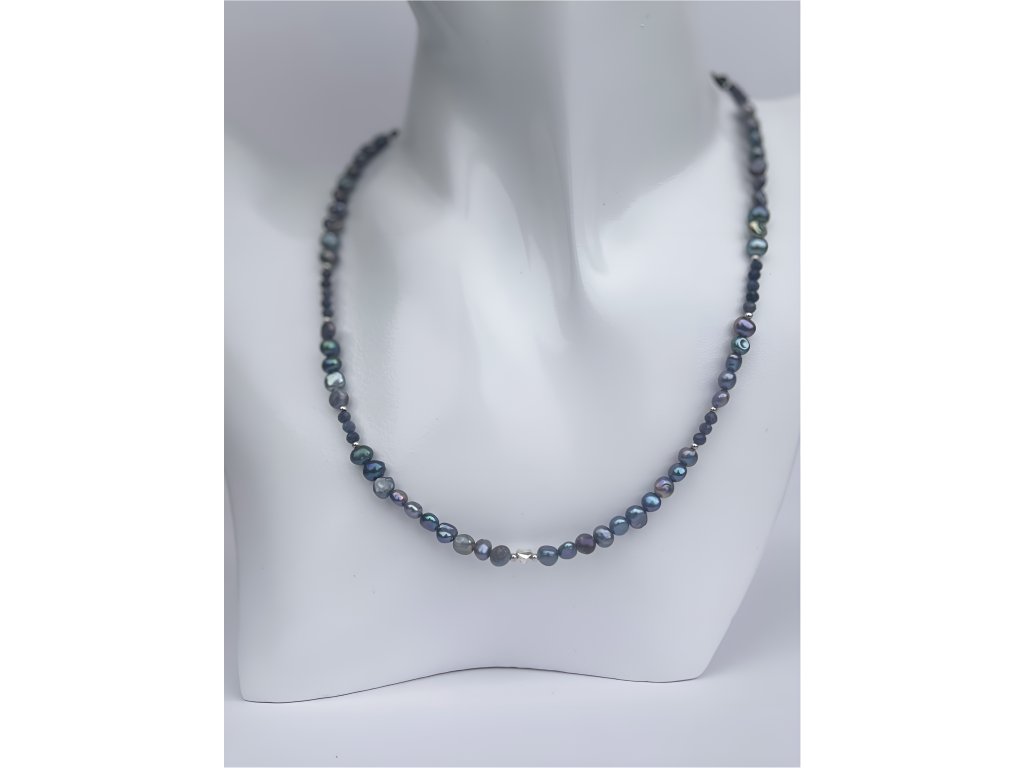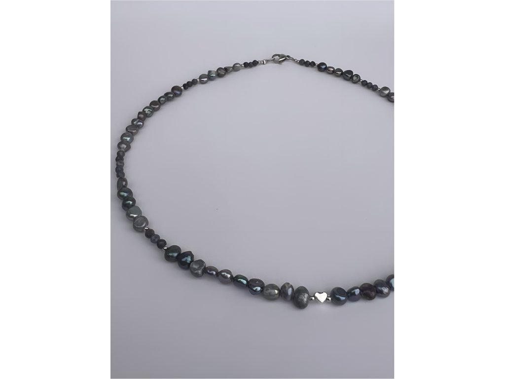 Tento ručně vyrobený náhrdelník spojuje nadčasovou krásu přírodních říčních perel s moderním nádechem v podobě stříbrných korálků z nerezové oceli. Kvalitní stříbrné zapínání dodává šperku luxusní vzhled a zajišťuje pohodlné nošení. Ideální jako doplněk pro každodenní eleganci i výjimečné příležitosti.