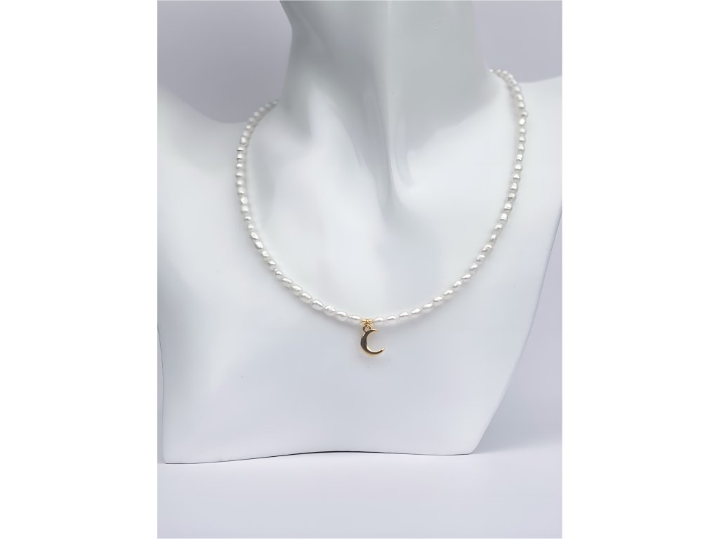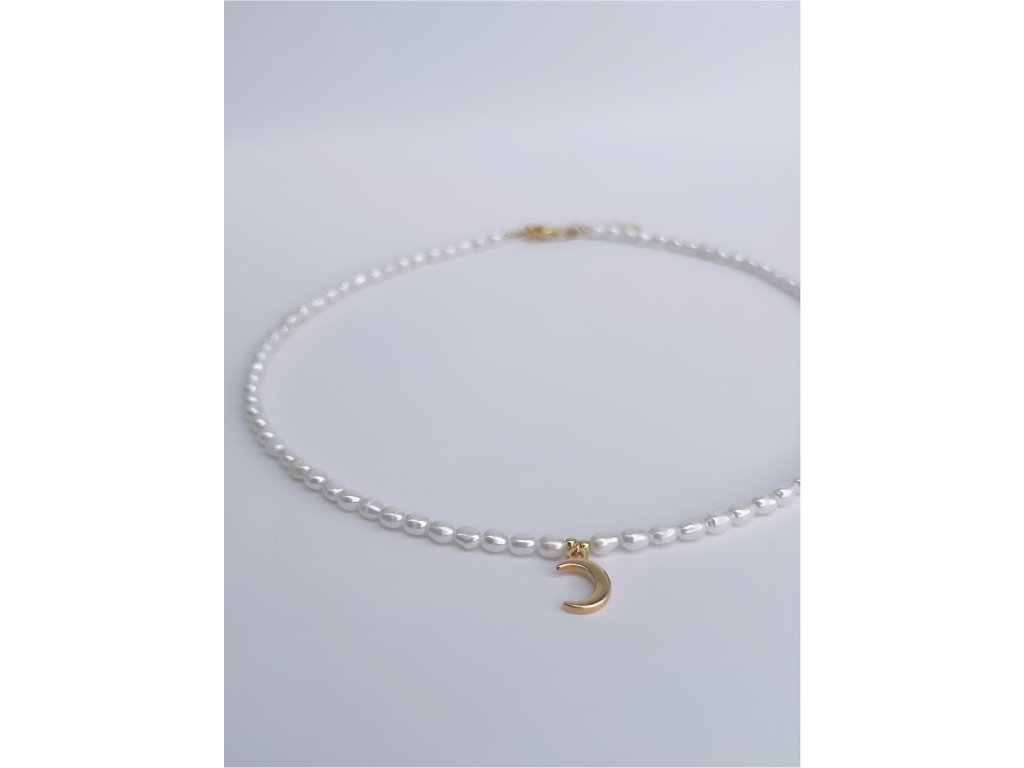 Náhrdelník s říčními perlami, pozlaceným přívěskem měsíce, zlatými nerezovými korálky a zapínáním.